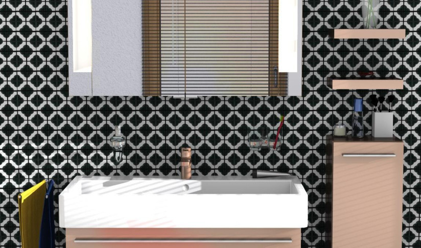 White gloss with black gloss "poppy" mosaics. Suitable for walls, swimming pools, kitchen splashback, etc.